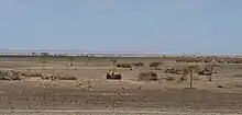 The high salinity makes the area home to only a few plant species. Most of the Chalbi Desert is barren and has no vegetation.[1] One of those areas where plants do grow is usually near outlets of tributary streams after the seasonal rainfalls. Salvadora persica, Acacia tortilis, and Cordia sinensis can grow in the areas around Chalbi's drainage system,[4][8] but most plants that grow in the desert are annual plants. One of those plants is Drakebrockmania somalensis.[8] During years of high rainfall, these areas can be seen covered by grasses like Aristida adscensionis and A. mutabilis.[4] Another region where some plants grow is in the former lake bed. There, one can find Lagenantha nogalensis. Finally, one can also find plants on the edges of the desert, such as Dasysphaera prostrata or Hyphaene coriacea.[8]