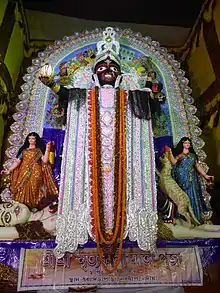According to the shape of the Chali, the structure of Durga Pratima has some varieties like Bangla Chali, Mothchouri Chali, Tanachauri Chali, Sorbosundori Chali, Khep Chali, Markini Chali. Among them, the commonly seen Chali is the Markini Chali.[4] The Bangla Chali follows the tradition of temple architecture. It stretches on both sides of the idol in a suspended pattern and is long enough to fit all the idols present there.[5]
