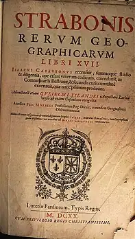 Republished work of Strabo, Geographica, titled "Strabonis rerum geographicarum libri XVII" with French translation on the right side of each page. Chamaecoetae as can be seen on page 506 under the name "χαμαικοῖται". The first and only existing mention of the tribe.
