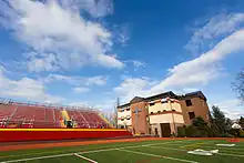 Chaminade's new Marianist Cross, Physical Fitness Center, and Gold Star Stadium from Ott Field