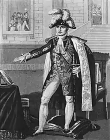 Napoleon travelled in formal procession to the ceremony. His coronation carriage, drawn by eight horses, was preceded by his mounted princes, and escorted by marshals of the Empire, including Michel Ney.[10] Napoleon wore silk robes, with a purple cloak, embroidered in gold with ermine trim and his imperial mantle. On his head he wore a black bicorne with a plume of feathers held in place by a large diamond.[10][9] The procession travelled via the Tuileries Garden, the Champs-Élysées and the Pont d'Iéna, through streets lined with citizens.[10] The embankments along the Champ de Mars were crowded with 200,000 onlookers.[5][13] Paraded in the Champ de Mars were, on one side, 25,000 National Guardsmen and, on the other side, 25,000 soldiers of the Imperial Guard and VI Corps together with 100 artillery pieces.[10][12]