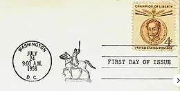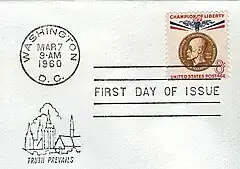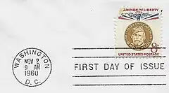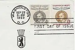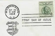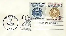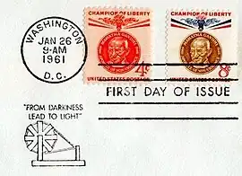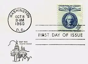 Champion of Liberty commemorative stamps, also known as the Champion of Liberty series, were a series of nineteen commemorative stamps issued periodically by the United States Post Office between 1957 and 1961 in honor of the men who fought for the cause of freedom and independence in their home countries. The stamp issues also served as a political and social statement against the perceived totalitarianism of the Soviet Union during the cold war. The First day covers were postmarked in Washington D.C. with specially made "First Day of Issue" cancellations that often included a symbol related to the man commemorated on the given issues.[1][2]