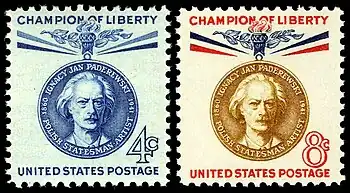 Ignacy Jan Paderewski, was an accomplished composer and pianist. . As an active member of the Polish National Committee he served as a representative to Washington who met with President Woodrow Wilson. After the First World War ended, he was appointed Prime Minister of Poland and later served as Polish Ambassador to the League of Nations. During World War II when German forces invaded and occupation Poland in 1939, he became the leader of the Polish National Council, which functioned as a Polish parliament while in exile in London. Paderewski ultimately "welded together" a new Poland.[21] The Paderewski issues were first released in Washington DC on October 8, 1960.[22]