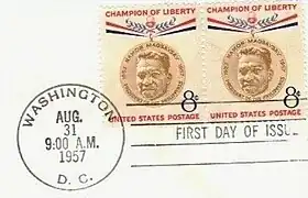 Ramon Magsaysay was a Filipino statesman who served as the seventh president of the Philippines, from December 30, 1953, until his death in an aircraft disaster on March 17, 1957.[4][5][lower-alpha 1] An oversized stamp issue compared to the others in the series, this is the only Champion of Liberty stamp that was first issued in the year 1957, in Washington DC on August 31 of that year.[6]