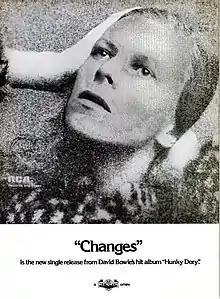 "Changes" is a song by the English singer-songwriter David Bowie from his 1971 album Hunky Dory. RCA Records then released it as a single from the album on 7 January 1972. Written following his promotional tour of America in early 1971, "Changes" was recorded at Trident Studios in London between June and July that year. Co-produced by Bowie and Ken Scott, it featured Rick Wakeman on piano and the musicians who would later become known as the Spiders from MarsMick Ronson, Trevor Bolder and Mick Woodmansey.