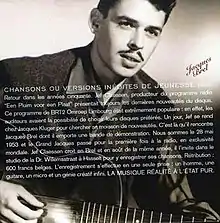 Chansons ou versions inédites de jeunesse (Early Unreleased Songs or Versions) is an album of Jacques Brel rare early recordings first issued as part of the 16-CD box set Boîte à bonbons on 23 September 2003. This CD contains 28 titles: 26 songs from Radio Hasselt recorded 14 August 1953 and 21 August 1953, a recording from the Brel family's private collection, and a 1962 recording from Dutch television AVRO.[1]