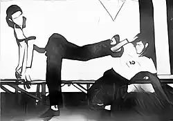 Mule kick is a direct kick delivered to the back, while looking through the arms to the opponent.[7] This kick starts with a bent knee and then thrusts directly towards the target. The sole of the foot is the striking surface.[7]