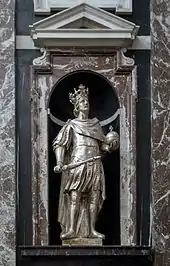 The chapel originally had eight pure silver sculptures that measured about 1 m (3 ft 3 in) in height and that were melted during the Deluge (1655–1660), but they stood in the main altar.[12] The marble niches were probably created in 1620s or 1630s[12] but there is no mention that they had any sculptures in them until 1737 when an inventory listed eight wooden sculptures of kings and emperors.[14] According to Marija Matušakaitė, the sculptures are of late Baroque style and should be dated the second quarter of the 18th century.[12] The first claims that the sculptures depict Polish kings were recorded in a 1828 report of canonical visitation and in a 1835 book on the history of Vilnius by Michał Baliński.[15] This theory of the Jagiellonian kings gained popularity and in 1878 the names were written in gilded letters on the postaments: Władysław II Jagiełło (Jogaila) (reigned 1386–1434), Władysław of Varna (1434–1444), Casimir IV Jagiellon (1447–1492), Saint Casimir, John I Albert (1492–1501), Alexander Jagiellon (1501–1506), Sigismund I the Old (1507–1548), and Sigismund II Augustus (1548–1572).[16] At some point, Lithuanian historiography replaced Władysław of Varna with Władysław IV Vasa (1632–1648).[17] The writings since has disappeared, but these names are often cited.[15]