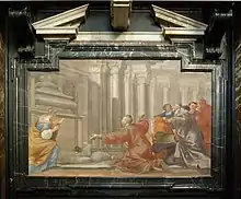 The Opening of the Coffin of St. Casimir measures 285 by 402 centimetres (112 in × 158 in) and decorates the east wall. It depicts the opening of St. Casimir's coffin on August 16, 1604 during his canonization proceedings. The body in the coffin was found intact, 120 years after the burial. The saint is wearing a long red robe, decorated with stoat fur, and a ducal crown. Bishop Benedykt Woyna, who wrote to Rome of a wonderful smell after the lid was lifted, has his hands raised to heaven in praise of the Lord.[2] Kneeling at the head of the saint is Gregorius Swiecicki, the canon at Vilnius Cathedral chapter, who was entrusted with Casimir's canonization process. Jan Kazimierz Sapieha who commissioned the painting stands on the right; Virgin Mary and Saint Peter, dressed in clothes of the time, stand on the left. Around them are priests with long candles in their hands.[2]