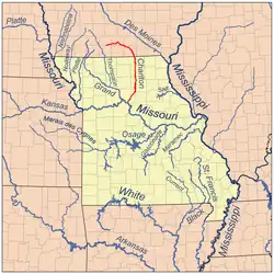 The Chariton River is a 218-mile-long (351 km)[3] tributary to the Missouri River in southeast Iowa and northeast Missouri. The river forms in southeastern Clarke County, Iowa. It is dammed at 11,000-acre (45 km2) Rathbun Reservoir in Appanoose County, Iowa and then flows 30 miles (48 km) before entering Missouri where it forms the boundary between Putnam and Schuyler counties. It enters the Missouri River in Chariton County near Keytesville. 112 miles (180 km) are in Missouri and 106 miles (171 km) are in Iowa.[3] The river has been called Missouri's "Grand Divide" because streams west of the Chariton flow into the Missouri and streams east of it flow into the Mississippi River.[4]