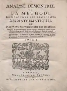 - Analyse démontrée, ou la Méthode de résoudre les problèmes de mathématiques, Paris, 1708, 2 t., in one vol. in-4°