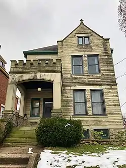 The Charles A. Miller House is a historic residence in Cincinnati, Ohio, United States. Built in 1890 according to a design by Samuel Hannaford,[1] it is a two-and-a-half story building constructed in the Gothic Revival style.[2]: 5 A brick and limestone structure with a slate roof,[3] its facade is dominated by courses of ashlar, plus battlements at the top,[2]: 5 and a prominent portico at the entrance.[4] The floor plan is that of a rectangle, two bays wide and four bays deep; the right portion of the building features a gable, while the battlements appear primarily on the left side. Structurally, the house is supported by a post and lintel construction, with the exterior courses of stones forming the lintels as well as horizontal bands around the building.[4]