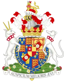 Arms of Charles Beauclerk, 1st Duke of St. Albans, prior to his marriage to Lady Diana De Vere in 1694, after which he added the De Vere arms as an escutcheon of pretence:[1] Royal arms of King Charles II debruised by a baton sinister gules charged with three roses argent