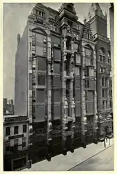 Clarke's Fagin Building, constructed in St. Louis, was commissioned by Aaron W. Fagin, the vice president of the Merchant's Exchange of St. Louis. Fagin wished, upon returning from a worldwide trip, to furnish St. Louis with a unique and original building. The Fagin building, when completed, was described by one newspaper with lavish praise in 1890.[2] In 1893, the building was described by one critic in the Architectural Record as the "most discreditable piece of architecture in the United States". In the same review, it was described to embody "all the vices and crudities that we call 'western', though in fact the geography has nothing to do with them."[5]