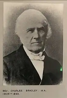 Bradley belonged to the evangelical school of the Church of England. He was born at Halstead, Essex, in February 1789. His parents, Thomas and Ann Bradley, were both of Yorkshire origin, but settled in Wallingford, where their son Charles, the elder of two sons, passed the greater part of the first twenty-five years of his life. He married, in 1810, Catherine Shepherd of Yattenden, took pupils and edited several school books, one or two of which are still in use. He was, for a time after his marriage, a member of St Edmund Hall, Oxford, but was ordained on reaching the age of 23, without proceeding to a degree, and in 1812 became curate of High Wycombe. Here for many years he combined the work of a private tutor with the sole charge of a large parish. Among his pupils were the late Mr. William Smith O'Brien, the leader for a short time of the so-called national party in Ireland; Mr. Bonamy Price, professor of political economy in the university of Oxford; and Archdeacon Jacob, well known for more than half a century in the diocese and city of Winchester. His powers as a preacher soon attracted attention. He formed the acquaintance of William Wilberforce, Thomas Scott, the commentator, Daniel Wilson, and others; and a volume of sermons, published in 1818 with a singularly felicitous dedication to Lord Liverpool, followed by a second edition in 1820, had a wide circulation. The sixth edition was published in 1824, the eleventh in 1854.