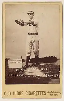 Comiskey started his playing career as a pitcher, and moved to first base after developing arm trouble. He is credited with being the first to play hitters off of first base, allowing him to cover balls hit to more of the infield. He entered the American Association in 1882 with the St. Louis Brown Stockings.[3] He managed the team during parts of its first seasons and took over full-time in 1885,[3] leading the Browns to four consecutive American Association championships and a close second in 1889.[4] He also played and managed for the Chicago Pirates in the Players' League (1890), the Browns again (1891), and the Cincinnati Reds in the National League (1892–1894).[5]