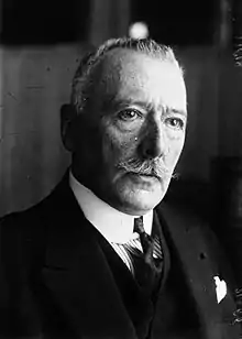 In a meeting in Paris on 8 January 1821 Jacques Seydoux told D'Abernon that the French proposed to indefinitely postpone discussion of cash reparations.[20] Soon after this Laurent recommended that Walter Simons, German Minister of Foreign Affairs, accept the Seydoux proposals as a basis for discussion and agree not to push for a declaration of the totals amount of the reparations.[21] D'Abernon and Laurent met on 4 February 1921 to discuss the negative reaction of the Germans to a proposed 12% tax on German exports. Laurent thought the Germans had not fully understood the implications, and noted that although the tax would raise the price of their exports it would remove the ability of the Allies to meddle with the German economy.[22]