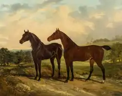 Charles Hancock (around 1800 – 30 July 1877) was a British painter of animals, specializing in equestrian sporting scenes. One of his largest and most recognizable works is the double portrait of two thoroughbreds in a wide landscape which he painted in 1828.