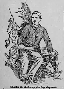 When he was just nine years old, Galloway began his career as a church musician at the Goode Avenue Presbyterian Church, where he accompanied the choir on melodion—although some accounts claim he was as young as seven. Due to his young age, Galloway was affectionately known as the “boy organist” for many years.[11] In 1883, he was hired by St. Peter's Episcopal Church, where he played on his first pipe organ. Four years later, he left St. Peter's and was engaged at various churches throughout St. Louis, including Pilgrim Congregational Church, the Temple Israel, St. George's Episcopal, and the First Presbyterian Church. He was later rehired as organist and choirmaster at St. Peter's Episcopal Church, where he remained until his death.[12]
