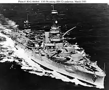 USS Wyoming at sea in March 1930. Forward gun turrets are conducting gun drills.