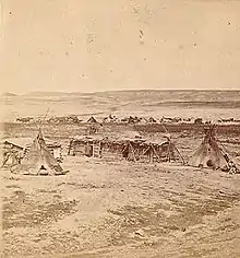 In 1860, Larpenteur became partner in an independent fur trading venture, Larpenteur, Smith & Company. The outfit went west over St. Paul and Pembina, and Larpenteur erected a trading post at Poplar River. Back in St. Louis in 1861, the company was reorganized as Larpenteur, Lemon & Company, due to dissension among the original partners. The same year, 1862, Larpenteur became a fur trader with a new company, La Barge, Harkness & Company.[6][7] In 1864 Larpenteur was back at Fort Union, now as Bourgeois or manager. Within a short time, however, the fort was sold the new Northwestern Fur Company, and Larpenteur resigned. In 1866 he served as an Assiniboine interpreter for the Indian Peace Commission, and the following year he became a fur trader for Durfee & Peck, but was fired after a conflict.[8] In 1869, Larpenteur brought his family from Iowa to Fort Buford, where he established a trading post. New regulations in 1870 limited the number of traders to one approved sutler per military post, and Larpenteur applied to the secretary of war, William W. Belknap for approval. This was, however, refused, and Larpenteur returned with his family to Iowa, where he died in 1872.[9]
