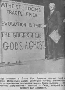 Charles Lee Smith. Signature under the image in Russian: Atheist hdqrs in Little Rock. The sign reads: Atheist hdqrs. Tracts free. Evolution is true, the Bible is a lie, God is a ghost. Near the sign, the chairman of American atheists is Smith, who was arrested for this sign. (Russian magazine «Bezbozhnik» («Godless») 1930, No. 10, p. 8)