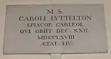 Almost immediately (13 August 1743) he was instituted to the rectory of Alvechurch, Worcestershire. Through his family influence he was made chaplain to George II in December 1747, installed as Dean of Exeter on 4 June 1748, and collated to a prebendal stall in Exeter Cathedral on 5 May 1748. In 1761 the Dean describes the cathedral library as having over 6,000 books and some good manuscripts. He describes the work which has been done to repair and list the contents of the manuscripts. At the same time the muniments and records had been cleaned and moved to a suitable muniment room. George Grenville, a cousin, pressed for Lyttelton's advancement. He was promoted to the see of Carlisle, and was consecrated in Whitehall Chapel on 21 March 1762, but his health was not good. He died unmarried in Clifford Street, London, on 22 December 1768, and was buried at St John the Baptist Church, Hagley, on 30 December. The chancel of that church had been ornamented in 1764 at his expense with shields of arms of his paternal ancestors.