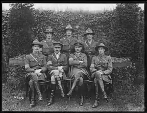 In England attending the Staff College at Camberley when the First World War broke out, Melvill returned to his former unit, the South Lancashire Regiment.[2] He embarked for the Western Front in August as part of the "Old Contemptibles" and was wounded the following month. After recovering from his wounds, he was posted to the School of Instruction, Westminster Command, as chief instructor. He then served as brigade major for the Tay Defences from May to September 1915 before transferring to the New Zealand Expeditionary Force (NZEF), which at the time was engaged in the Gallipoli campaign.[1] Initially a staff officer, he served under Brigadier General William Braithwaite as brigade major of the New Zealand Rifle Brigade following the evacuation of the Allied forces from Gallipoli in December.[1][5]