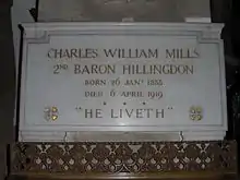Charles William Mills, 2nd Baron Hillingdon (26 January 1855 – 6 April 1919) was a British banker and Conservative politician who sat in the House of Commons from 1885 to 1892, speaking once, in 1889.[1]