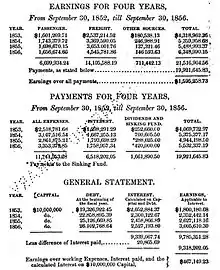 - "...remembering as they may, that for four years, commencing on 1 October 1852, when the trains first ran through from Jersey City to Dunkirk, and ending September 30, 1856, the earnings over all working expenses paid the interest on the debts, and left a surplus more than sufficient to pay full interest to the Stockholders; though 'part of that surplus went to the general improvements. The figures and facts are not to be found in any one publication,' and therefore may with advantage be collected here, as the commencement of an attempt to understand the real condition of the Company's affairs."