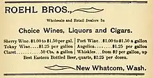 In 1889, the Roehl brothers returned to Whatcom and restarted their business as wine, liquor, and cigar merchants, their specialty being "the best Kentucky whisky."[8][5][9]