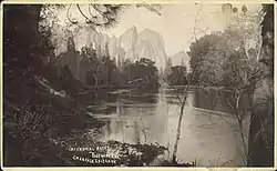 By 1866 Savage's Views of the Great West, a stereoscopic series, was sold by the Union Pacific and Denver & Rio Grande Western railroads. These railroads gave him a free pass to ride wherever he wanted.[10] The same year he took a tour of major photography studios in the United States, both to improve his photography skills and to publish reproductions of his photos. In San Francisco, he met Carleton Watkins, who described his method for producing large works by placing developed negatives in a water bath until he was ready to finish them. Savage noted that Watkins's method was cumbersome, but envied his results.[19] He traveled by boat to New York City, where progress in photography instruction and technology inspired him. While in New York City, he made an agreement with Samuel R. Wells, who sold photos that Savage took, while Savage sold Wells' publications in his photography studio back in Utah. Savage made similar agreements with other distributors.[20] After having a darkroom wagon custom made, spending $3,400 on photographic supplies from E. and H.T. Anthony Co., he traveled with a group of Mormon settlers back to Salt Lake City.[21] Most of his new supplies were lost when his wagon tipped over while crossing the Platte River on his return trip. Savage paid back some of the debt over nine years, but stopped paying when he was on the verge of bankruptcy. The company sued him, and after a long legal battle, the debt was settled in 1883.[22]