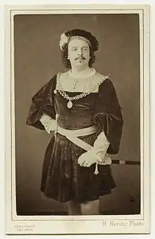 Santley appeared in English opera for Mapleson at Her Majesty's Theatre in the 1860–61 season. Mapleson mounted a new opera, George Alexander Macfarren's Robin Hood, featuring a cast led by Sims Reeves and stage-debutante Helen Lemmens-Sherrington, under the direction of Charles Hallé. In the same season Santley sang (for Pyne and Harrison) Fra Diavolo, La Reine Topaze, The Bohemian Girl (with Mme Parepa), Il trovatore and Wallace's The Amber Witch, which later transferred to Drury Lane.[18] He was announced to sing in Verdi's Macbeth with Giulia Grisi in 1861, but the promotion collapsed.[2]