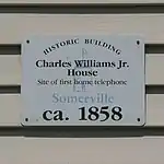 The Charles Williams Jr. House, built in 1858, is a historic house in Somerville, Massachusetts. Charles Williams Jr. was a manufacturer of electrical telegraph instruments at 109 Court Street in Boston. Alexander Graham Bell and Thomas A. Watson experimented with the telephone in Williams' shop, and it was there that they first heard indistinct sounds transmitted on June 2, 1875. The first permanent residential telephone service in the world was installed at this house in 1877, connecting Williams' home with his shop on Court Street in Boston.[2] Williams had telephone Numbers 1 and 2 of the Bell Telephone Company.