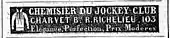 In 1839, Charvet already had some imitators,[n. 3] but still the "best supply".[24] The same year, Charvet held the title of official shirtmaker to the Jockey Club,[16] a very exclusive Parisian circle, then headed by Prince Napoléon Joseph Ney and inspired by Count Alfred d'Orsay, a famous French dandy.[25] It had about 250 members, mostly aristocrats, who, despite the name of their club, were more interested in elegance than horses. Being a member was a necessary step in order to become a lion, the term used then for a dandy.[26] In an advertisement of March 1839, Charvet, presenting himself as the Club's shirtmaker, claimed to offer "elegance, perfection, moderate prices".[27] Soon after, the claim to moderate prices was dropped (see images, right).[28]