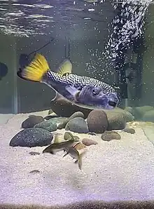 Though C. bengalensis is closely related to C. patoca, they are distinct species.[1] A group of researchers from Bangladesh and South Korea ran their scientific research from May 2016 to December 2017 in Sundarban and discovered the new species of pufferfish.[4] The color of the species is blackish and it has tints like trellis.[5] It can grow to 32 cm (13 in) standard length.[2]
