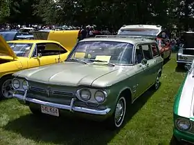 The Chevrolet Lakewood is a four-door station wagon produced by Chevrolet for the 1961 model year. Chevrolet dropped the "x-wood" names for their station wagon models at the end of 1961 so the 1962 Corvair Station wagons do not continue the Lakewood name. In appearance, and technical respects it resembled the Volkswagen Type 3 Squareback, but power came from the Corvair's rear-mounted Chevrolet Turbo-Air 6 engine with 145 cu.in. displacement which developed 80 bhp (60 kW) at 4,400 rpm. The station wagon Corvairs were built on the same unibody as other sedan Corvairs with a 108 in. wheelbase. Standard transmission was a 3-speed manually shifted transaxle.