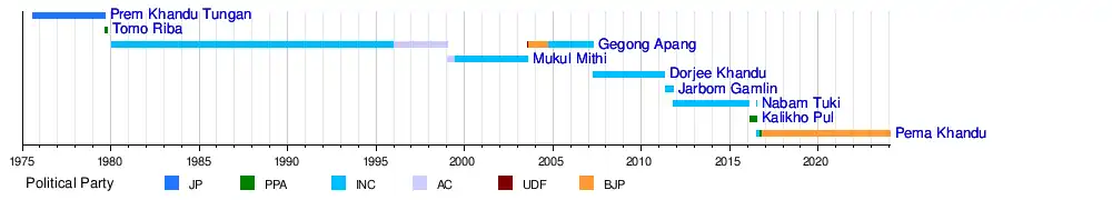 | 1 | Prem Khandu Thungan | Dirang Kalaktang | 13 August 1975 | 18 September 1979 | 4 years, 36 days | 1st | Janata Party[lower-alpha 3] | ||