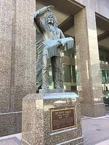 Sitting Eagle, also known as John Hunter, was the chief of the Stoney Nakoda First Nation in the town of Morley, Alberta, which is home to the Chiniki, Bearspaw, and Wesley bands of Nakoda.[1] Chief Sitting Eagle was born in 1874[2] and became heavily involved in the Calgary Stampede, over the years coming to be considered a symbol of the event himself. He died in 1970. In 1988, a 3.4-metre (11 ft) statue of Chief Sitting Eagle was unveiled in downtown Calgary.
