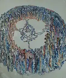 Seasonal Ritual (1990) was created using pen, ink, and watercolor on paper measuring 70 cm by 50 cm (27 x 19 in).[24] The piece displays a circle of people connected to a smaller group of people in the center. The center symbolizes community, how it connects to Aniakor's creativity, and how it plays a role in everyday society.