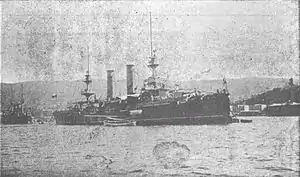 As a protected cruiser, the ship's vitals were protected by a full-length arched deck of steel armour, 3+12 inches (89 mm) thick on the slopes and 1+14 inches (32 mm) on the horizontal part of the deck. The ship's conning tower was protected by 4 inches (100 mm) of armour.[4][1] The ship's main gun armament consisted of eight 6-in (152 mm) 45-calibre quick-firing guns, with two fore-and-aft on the ship's centreline, and three on each beam. The secondary armament was ten 6-pounder (57mm) guns and four 3-pounder (47mm) guns. The ship was fitted with three 18-inch (450mm) torpedo tubes, one fixed in the bow and the other two on swivelling mounts on the ship's broadside.[1]