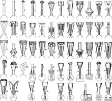 Early spark arrestors were simply iron wire screens installed within the stack. However, the screen reduced the rate at which smoke and steam could escape from the boiler. As well, embers caught by the screen further reduced available space for the passage of steam, and smoke and heat generated by the burning embers rapidly melted the wire screen. Chimney top diameters were enlarged to increase screen surface area and reduce smoke velocity through the screen so that embers could fall away from the screen into collection hoppers. In response to an 1857 patent infringement claim, Baldwin Locomotive Works compiled a diagram illustrating 57 different spark arresting chimney designs.[4]