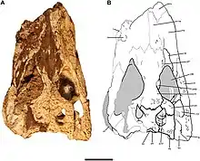 Most of the dorsal surfaces of the relatively short and wide nasals are entirely missing. Along the cranium's midline are paired molds of the grooved ventral surfaces of the nasals.[1] The anteriorly elongated nasals appear to have tapered slightly towards their anterior articulations with the maxillae and premaxillae. Though the anteriormost portion of the cranium is not very well-preserved, it seems there was at least a slight projection of the nasals beyond the posterior extent of the naris. Whether an internarial bar would have entirely bisected the nares is unclear.[1]