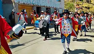 - Contra Danza: A dance of Colonial Peruvian origin. It parodies the colonial elite who, at the time, would reject Indigenous and Mestizo people from their ballroom parties in larger cities like Cusco. The dance was started by farmers who organized their own "contra danzas" - literally, "Against Dances" - in protest of the Spanish elites. Leading the dance troupe is a person dressed in blue like a Landlord of the time; other dancers wear red scarfs around their hips and colorful pants.