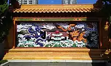 The Dragon Wall is a double sided, free-standing screen made of glazed terracotta from China, commissioned specifically for this garden and a gift from the government of Guangdong. The wall depicts a blue dragon representing New South Wales and a brown dragon representing Guangdong, both are in search of the pearl of wisdom. The wall design is based on the "nine dragon walls" in Datong, Shangxi. The wall was manufactured by Shiran Glazed Pottery in 943 pieces and assembled on site by potters from China.[1]