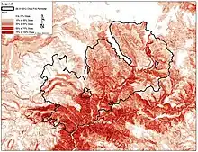 A map of terrain slope within the Chips Fire footprint, with darker shades of red representing steeper slopes