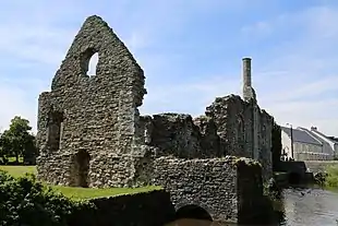 Nearby is a domestic Norman dwelling, known as the Constable's House, which was built within the original castle bailey in 1160. Much of the stonework survives, including a rare example of a Norman chimney (one of only five in the country). The stone used for construction was Purbeck marble.[4] The ground floor which has four slit windows was used as a storeroom. The upper floor, accessed by steps outside and an internal staircase, contained the main hall. It is 67 by 23 feet (20 by 7 m) in size.[4] As well as the chimney, another notable feature is the garderobe tower, which extends over the mill stream added in the early 13th century to provide sanitary arrangements.[1]
