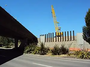 Duplication of the Lincoln Road overbridge on the Christchurch Southern Motorway, December 2011. The original 1981 two-lane bridge is to the left.