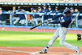Yelich and the Marlins finalized a seven-year, $49.57 million contract extension on March 22, 2015.[19] He struggled to start the season, and was placed on the disabled list in April with lower back strain before making his return on May 8.[20][21] His batting average reached a season low of .178 on May 22.[22] In August, Yelich bruised his right knee and was again placed on the disabled list.[23] Yelich had improved from his earlier offensive struggles and was hitting .275/.343/.376 with six home runs, 29 RBIs and 14 stolen bases up to that point in the season.[24][25] Despite aggravating the injury shortly after his return, Yelich remained an active player for the quality of his bat.[26][27] Near the end of the season, Yelich shared the field with Marcell Ozuna, the outfielder who had replaced him during his second stint on the disabled list.[28] Yelich closed the 2015 season with a .300 average.[22] For the season, he had the highest ground ball percentage (62.5%), and the lowest fly ball percentage (15.0%), of all major league hitters.[29]