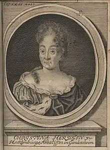 Christina, Duchess of Mecklenburg-Schwerin (8 August 1639 - 30 June 1693) was a princess of Mecklenburg-Schwerin. Between 1681 and 1693 she served as the Abbess at Gandersheim. She was also a Princess of the Empire (Reichsfürstin).[1][2]